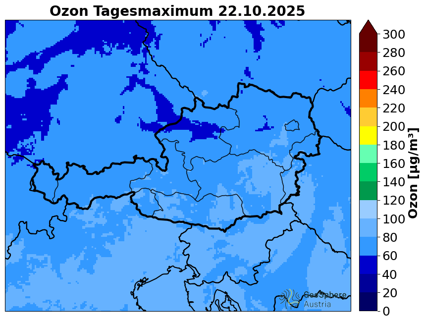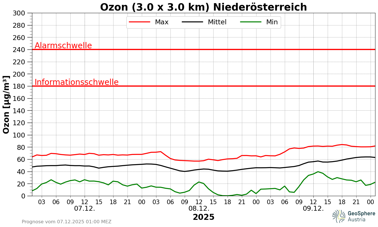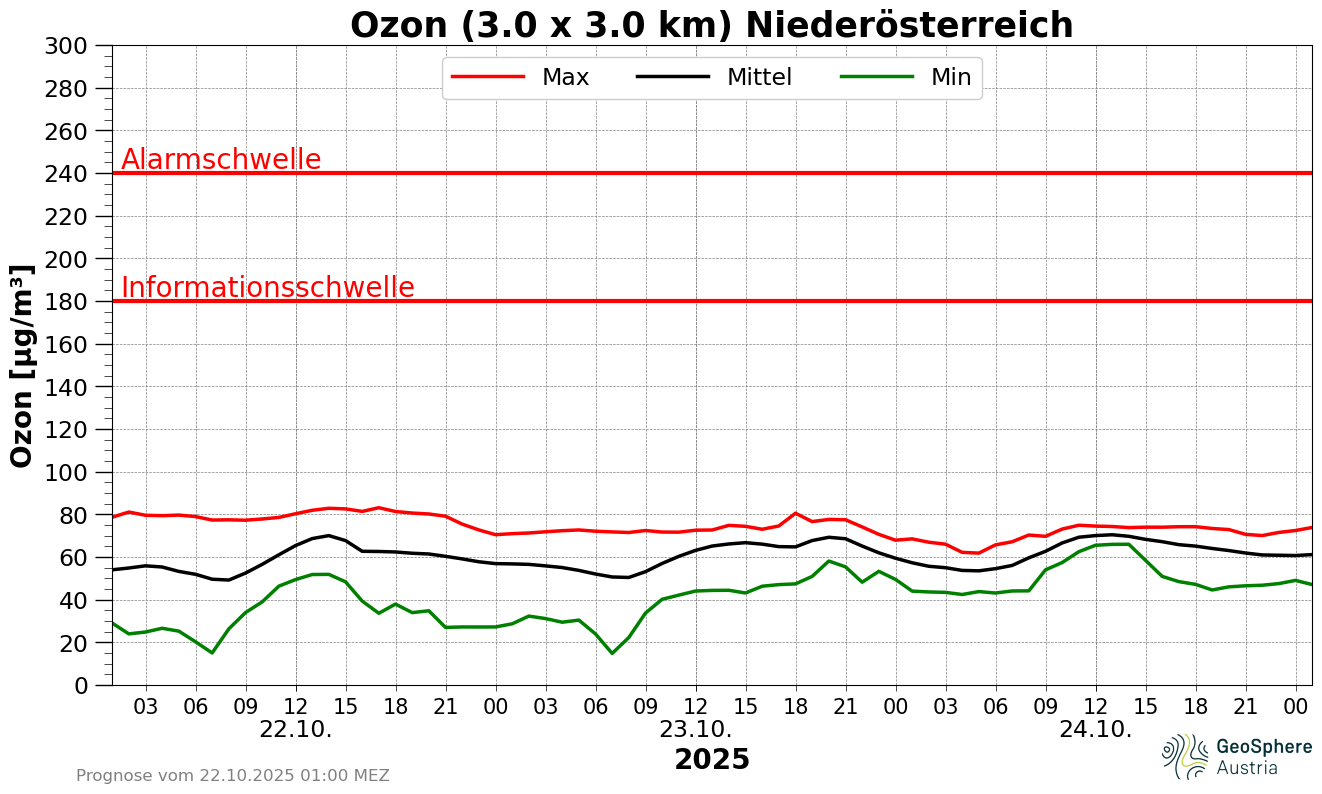 Die GeoSphere Austria erstellt im Auftrag der Niederösterreichischen Landesregierung eine tägliche Ozonprognose. Diese Prognose kann mit hoher Wahrscheinlichkeit eine mögliche Überschreitung der Informationsschwelle voraussagen. Wie bei der Wettervorhersage gibt es allerdings auch bei dieser Prognose Unsicherheiten und Fehlprognosen.Die Bereitstellung der Diagramme erfolgt automatisch und kann sich aus technischen Gründen unter Umständen verzögern. Bitte beachten Sie daher die Datums- und Zeitangaben in den Diagrammen!